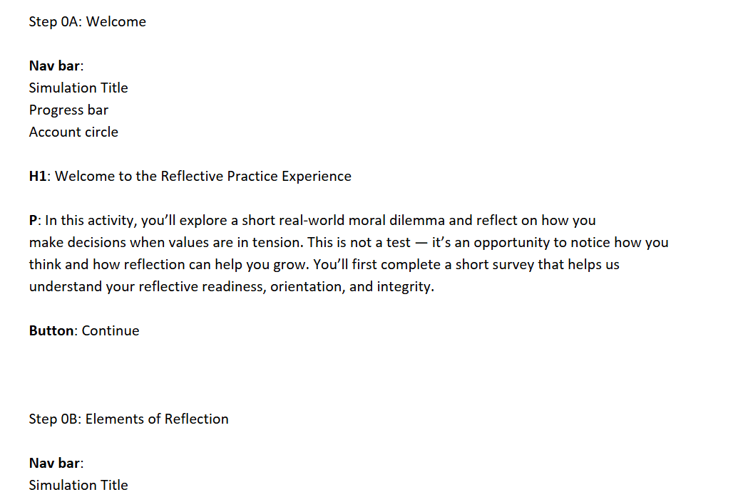 Reviewed documentation outlining the reflection framework used to guide students through ethical decision-making.