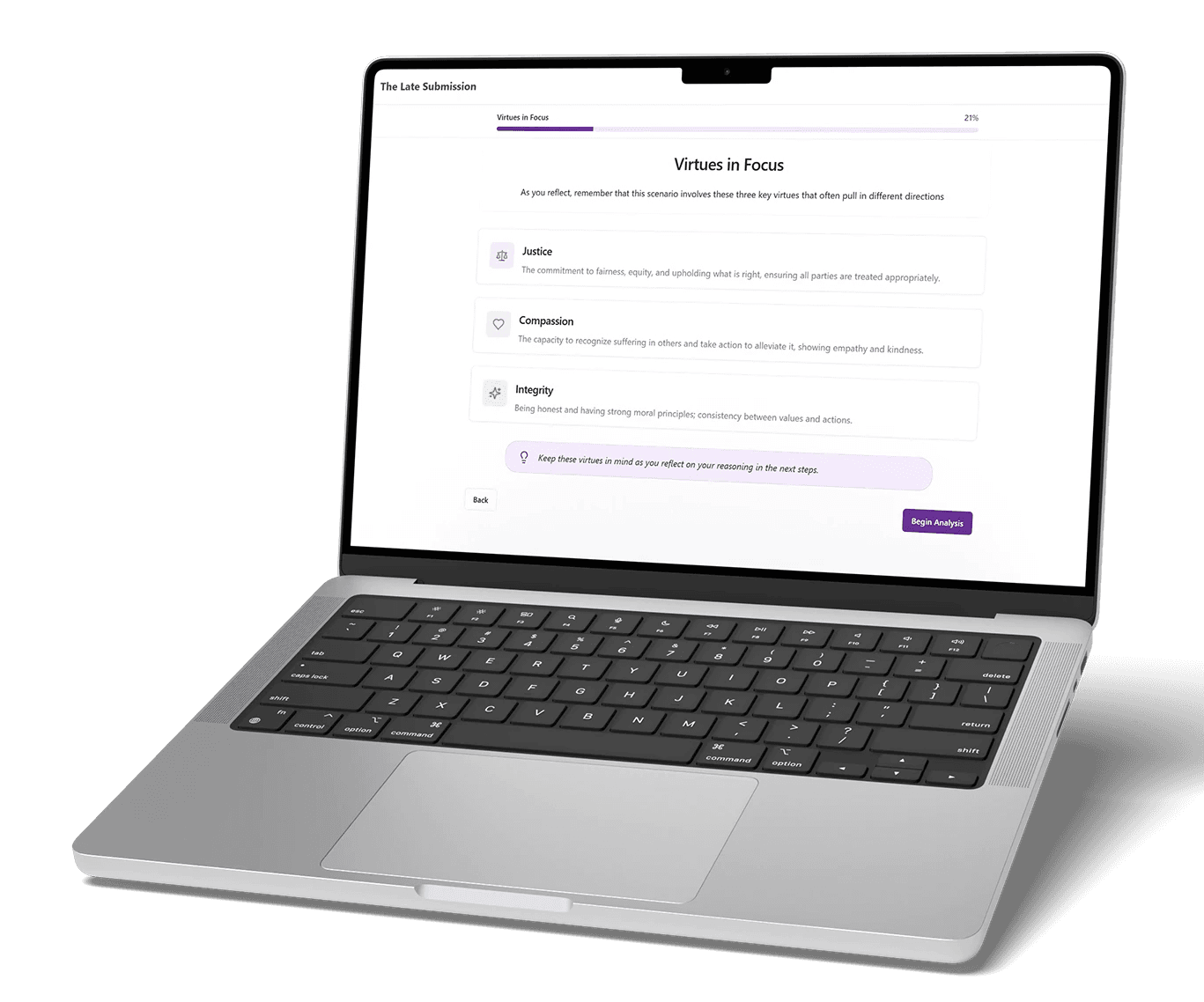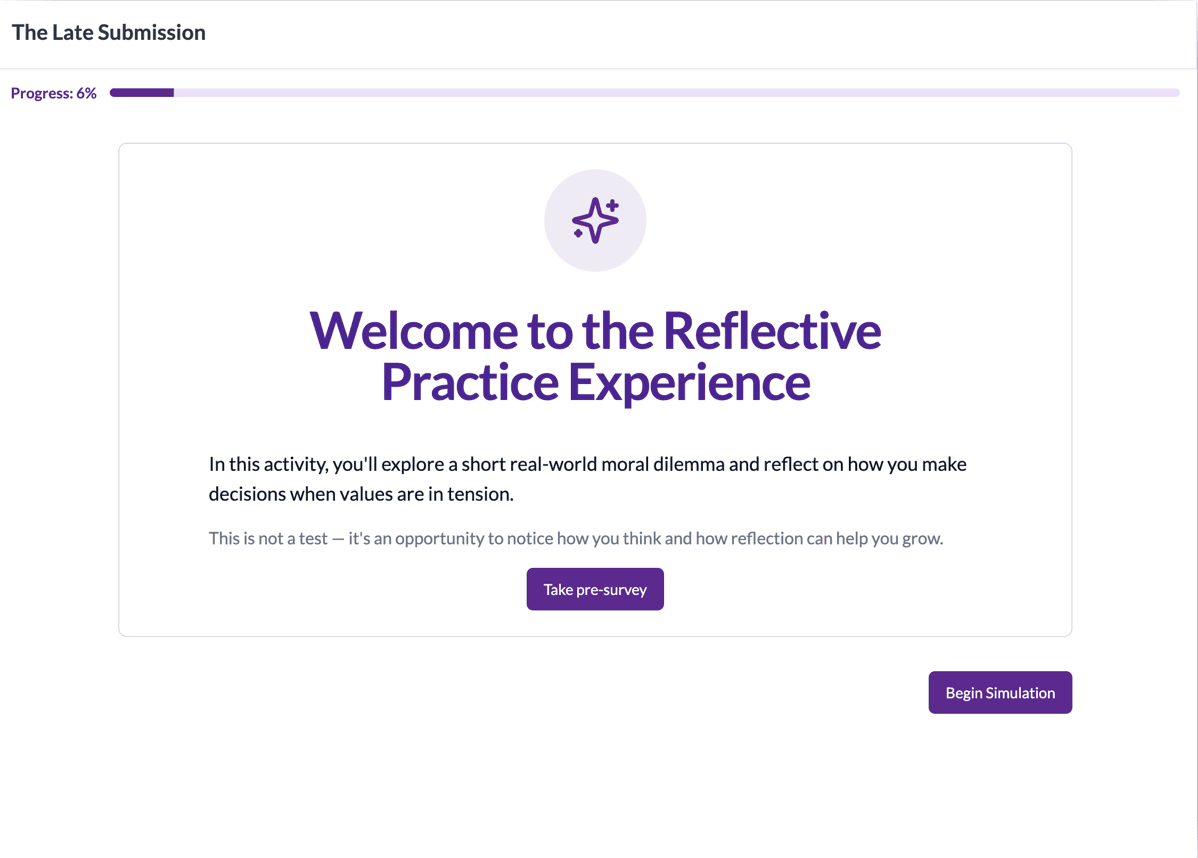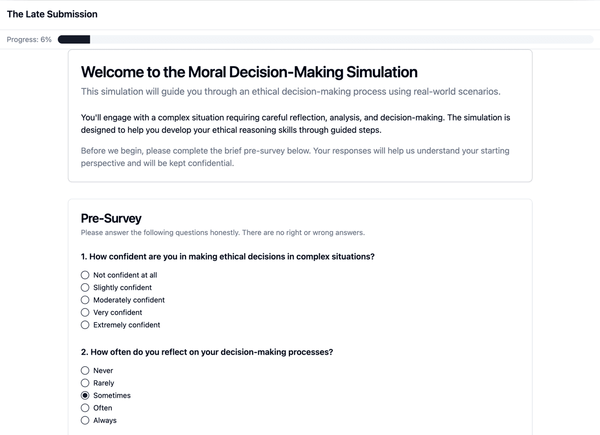 - Product: A simulation-driven app where students work through moral dilemmas and researchers analyze their written responses and behavioral data.