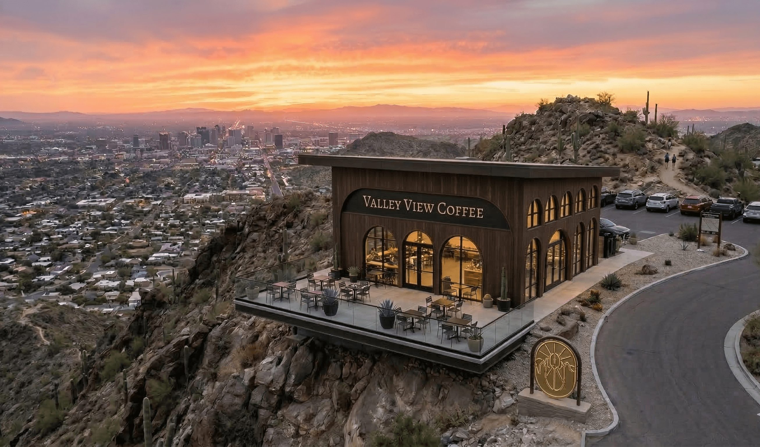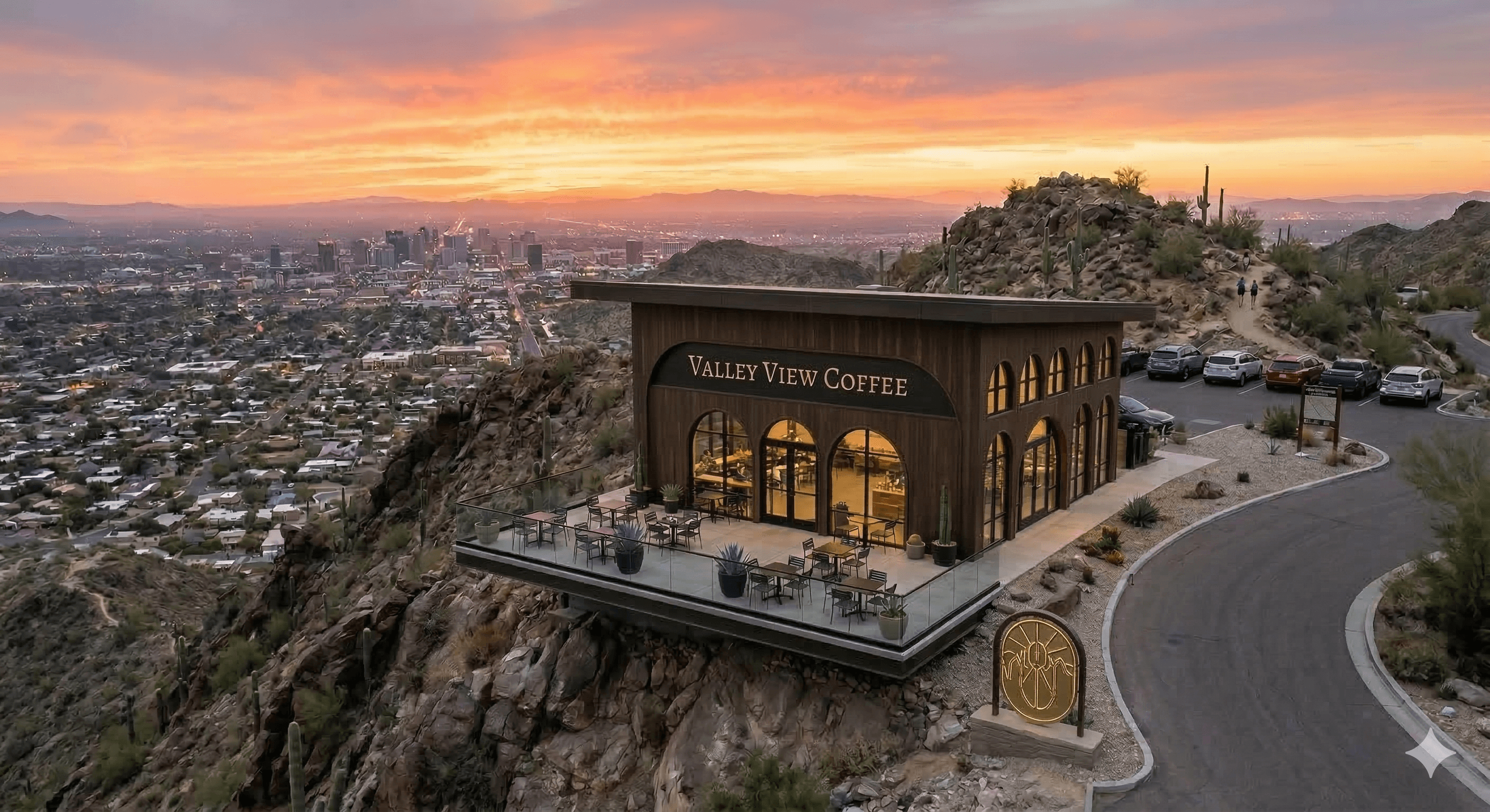 In another document, I noted logos and colors that suited Valley View Coffee. After developing the brand, I used Google Gemini to create a realistic idea of the coffee shop and its location.